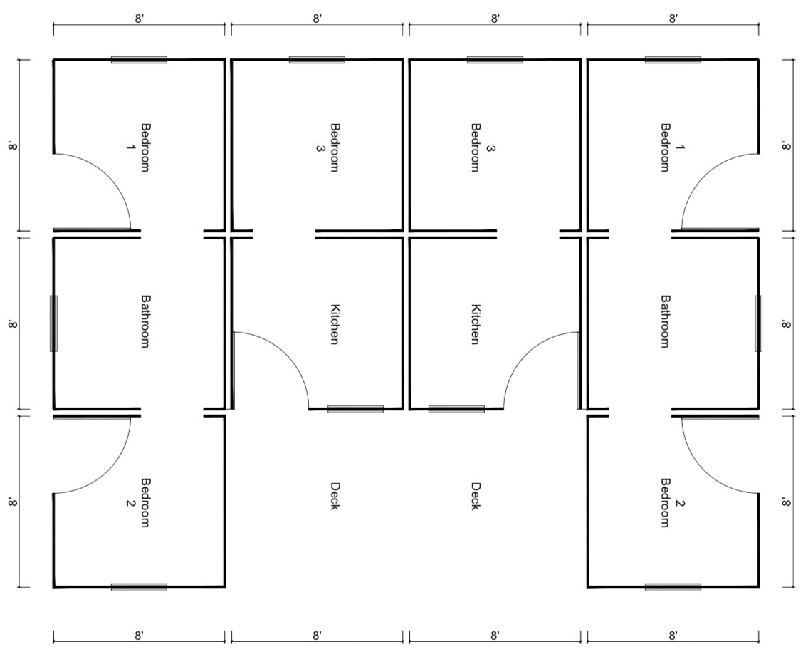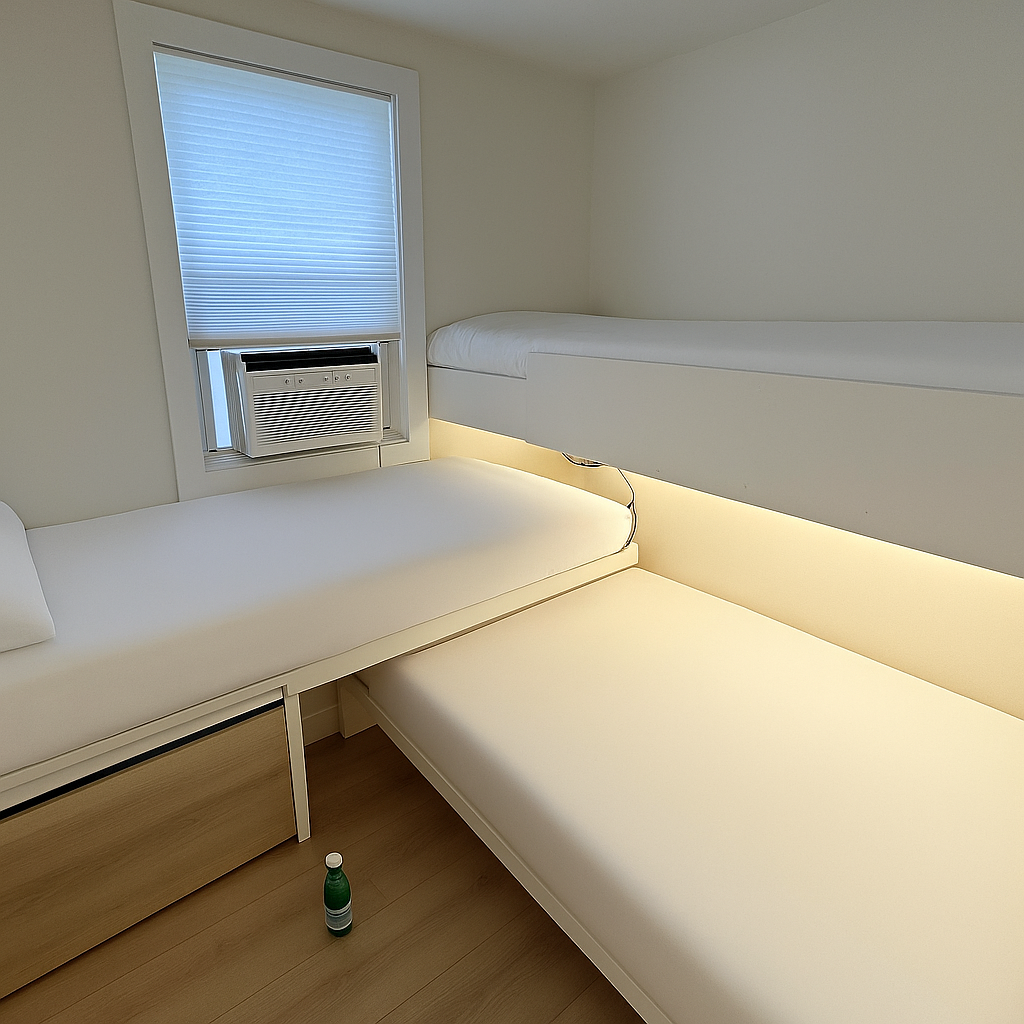 This twin-unit duplex uses a hybrid modular system: ten units (five per 40-ft container) ship in just two containers. Certified factories build the kitchen/bath wet cores, while local DIY builders make the bedroom units — creating scalable capacity, low cost, and local jobs.