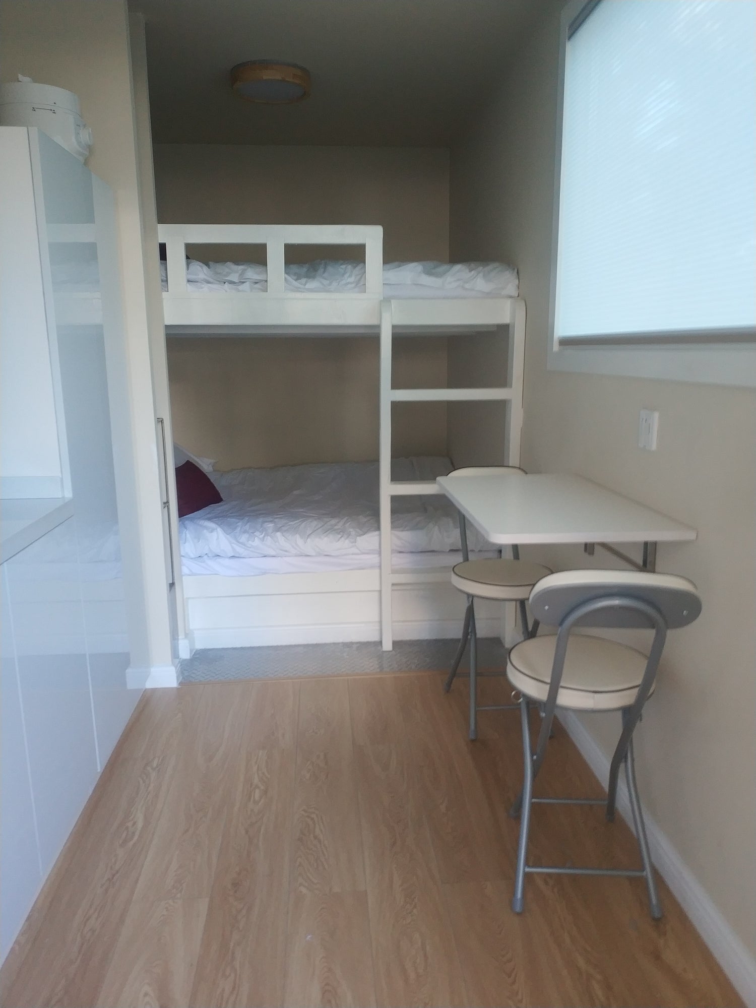 This 10 m² BeeHome Max prototype includes a built-in Rocket Stove heater, upper-and-lower bunk beds, a foldable workstation, a forced-filtration fresh-air system, passive-house-grade doors and windows, a high-efficiency heat-pump AC, and a 2.5 kW solar roof.